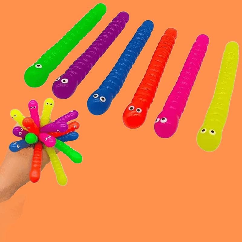 Design: Conjunto de 5 lagartas coloridas que se esticam, puxam e se torcem, estimulando coordenação motora e criatividade