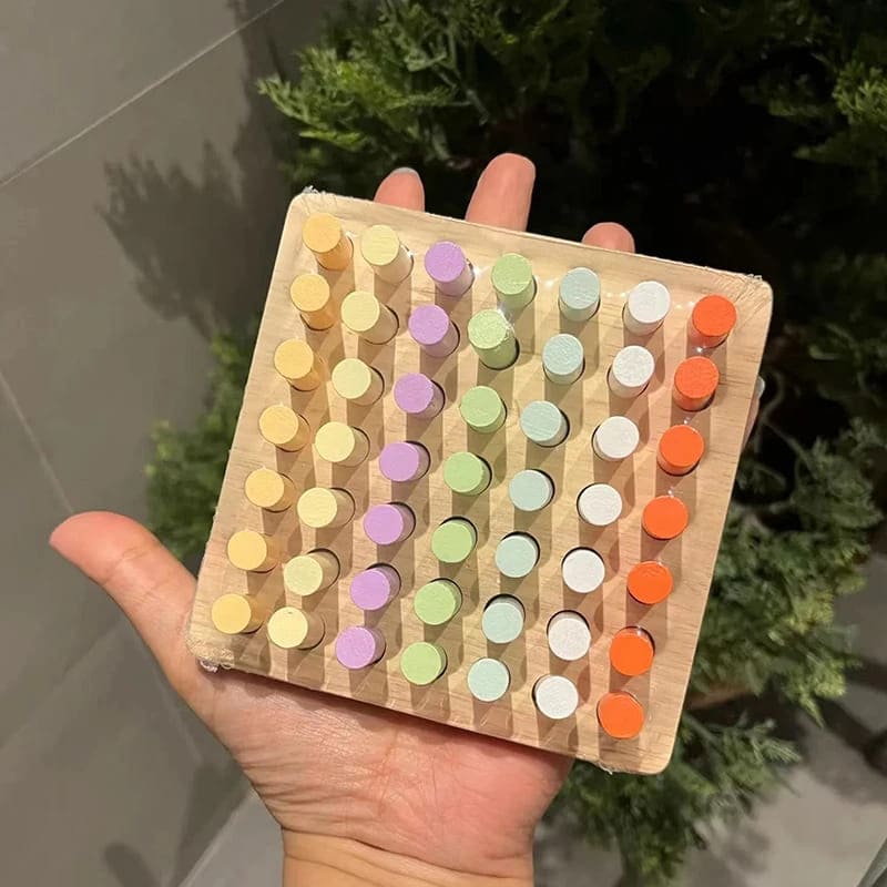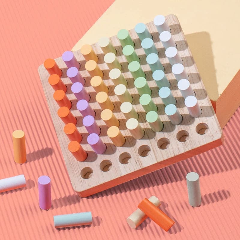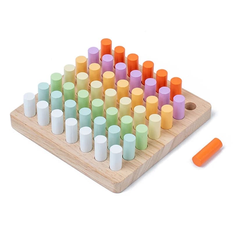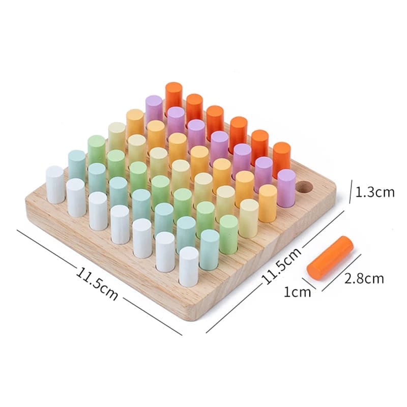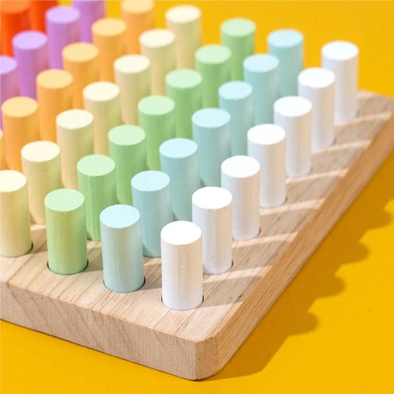 Design: Painel com pinos coloridos para encaixar, desenvolvendo coordenação motora e percepção de cores de forma divertida e educativa.