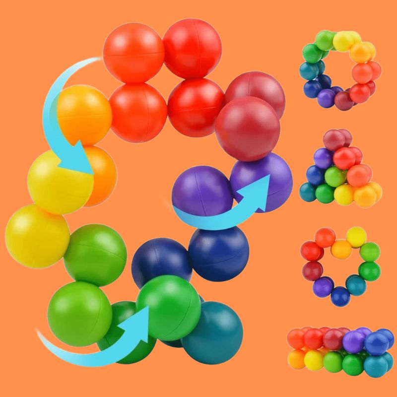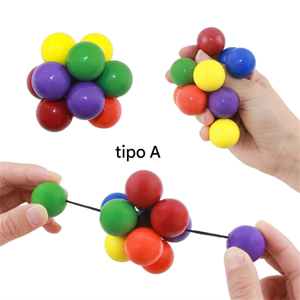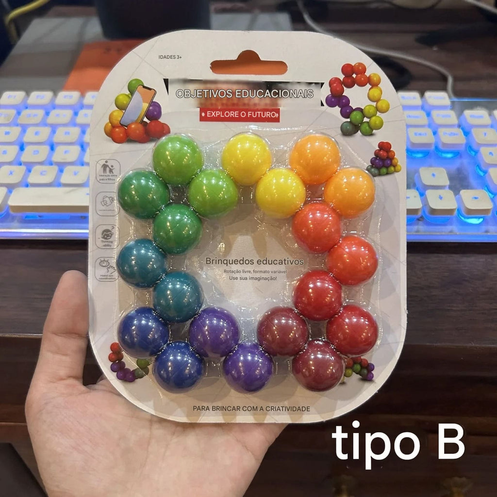 Design: Pequena e colorida, com 20 pequenas esferas que podem ser giradas e transformadas em diferentes formas, estimulando percepção de cores e habilidades cognitivas